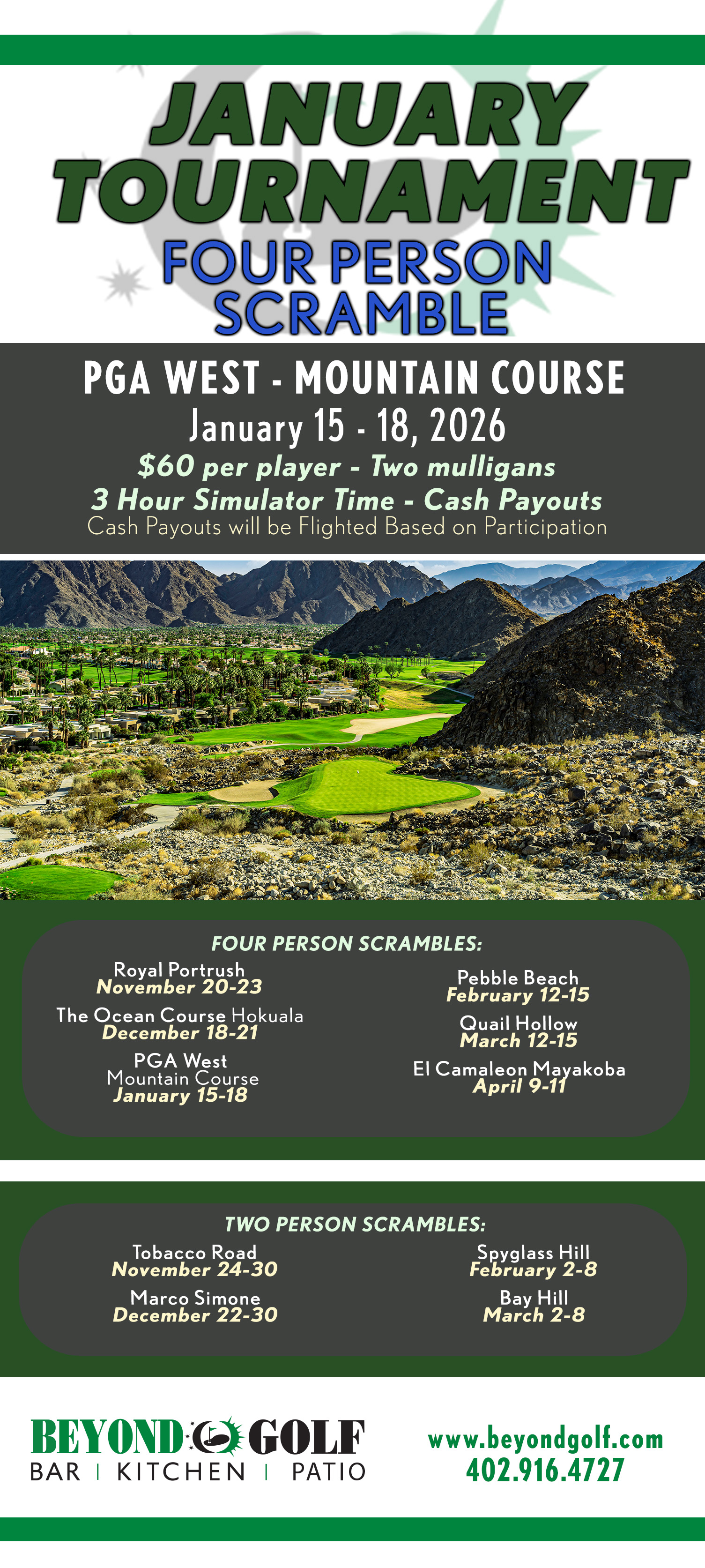A credit card is required for ALL bookings. YOUR CARD WILL NOT BE CHARGED unless in case of a no show. A 24 hour notice is required to cancel or make changes to your tee time.